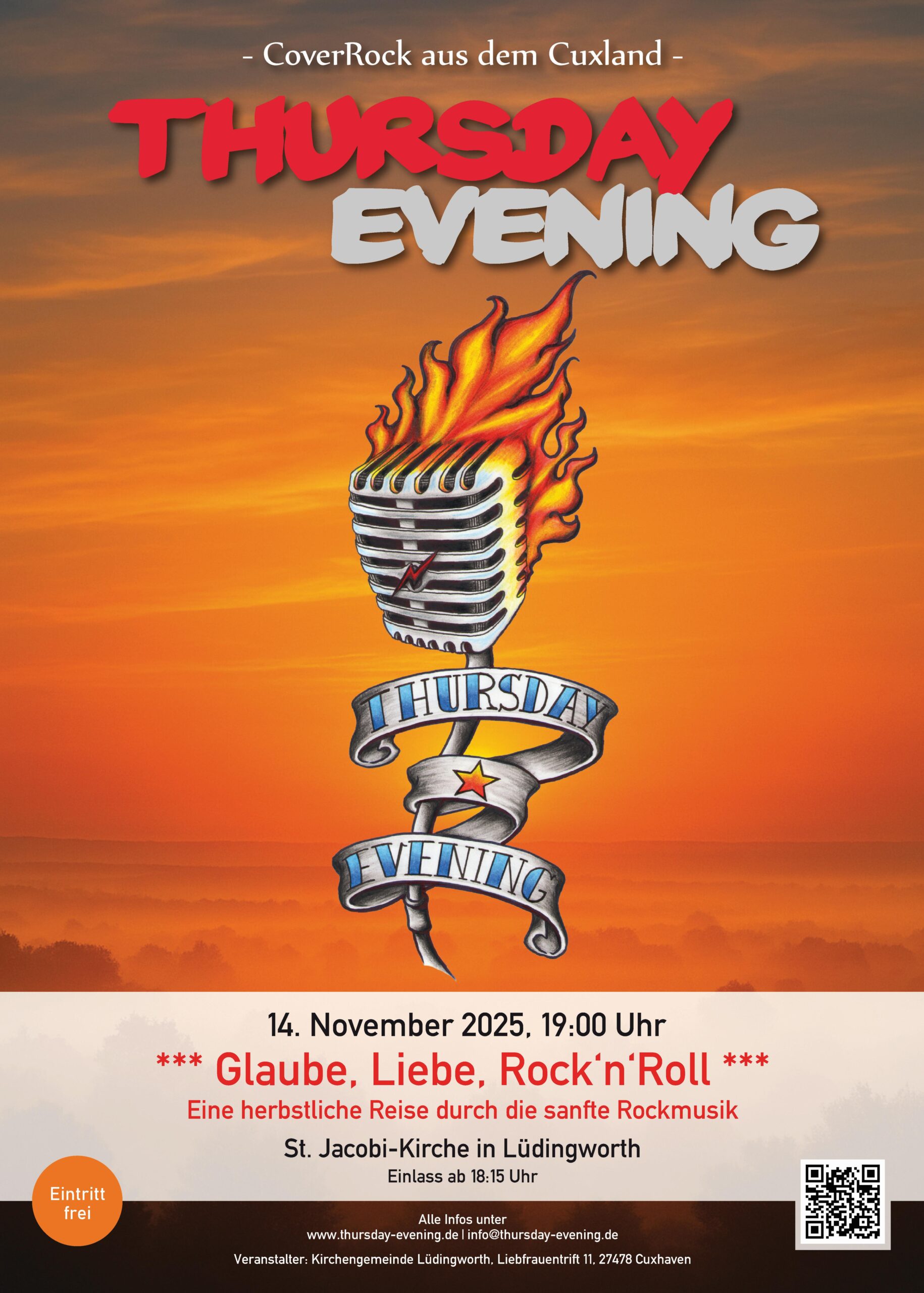 Mit der Cuxhavener Coverband Thursday Evening kommen alle (Alt)Rocker auf Ihre Kosten. Am Freitag, den 14. November 2025 verspricht die Band mit eigenen Akzenten, und immer hart am Original vorbei, einen rockigen Abend in der St. Jacobi Kirche in Lüdingworth. Der Einlass ist ab 18:15 Uhr, der Eintritt ist frei. Infos über die Band gibt es hier.